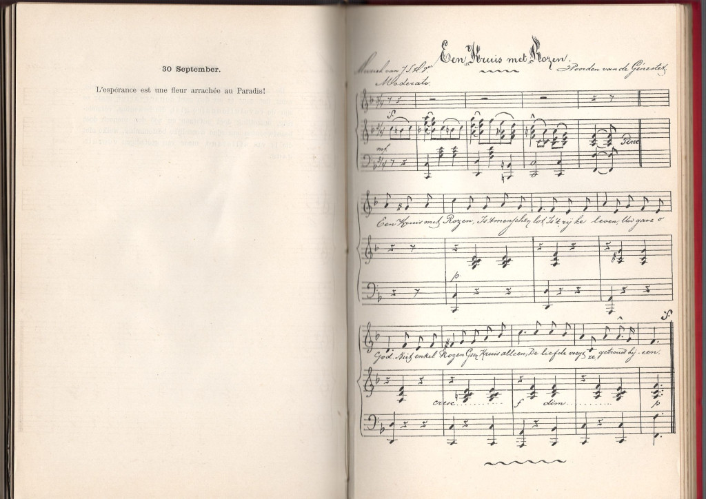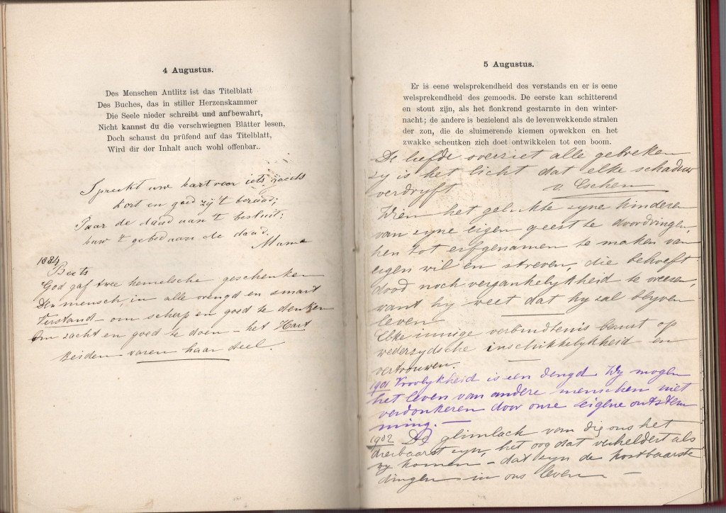 Kézírásos bejegyzések: főként holland és francia nyelvű bölcsességek, saját gondolatok. Éveken át készülő könyv.