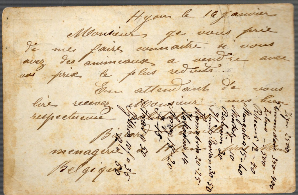 A hátoldali francia nyelvű üzleti szöveg állatok vásárlására vonatkozó megkeresés, Hamburg–St. Pauli címzettel, amely a korszak egyik legfontosabb állatimport központja volt.